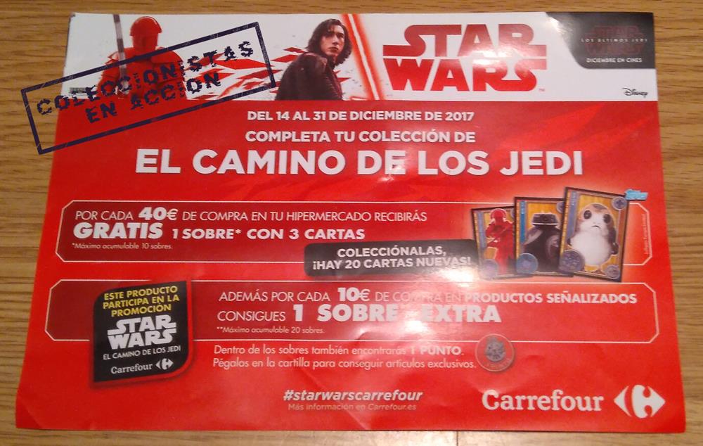 viernes, 22 de septiembre de 2017. Promoción cartas Star Wars en Carrefour - El Camino de Los Jedis Con la nueva película de Star Wars llega también una nueva promoción de cartas a los centros comerciales Carrefour. En esta ocasión son 80 cartas con imágenes de las 8 películas ya conocidas y 18 adhesivos.