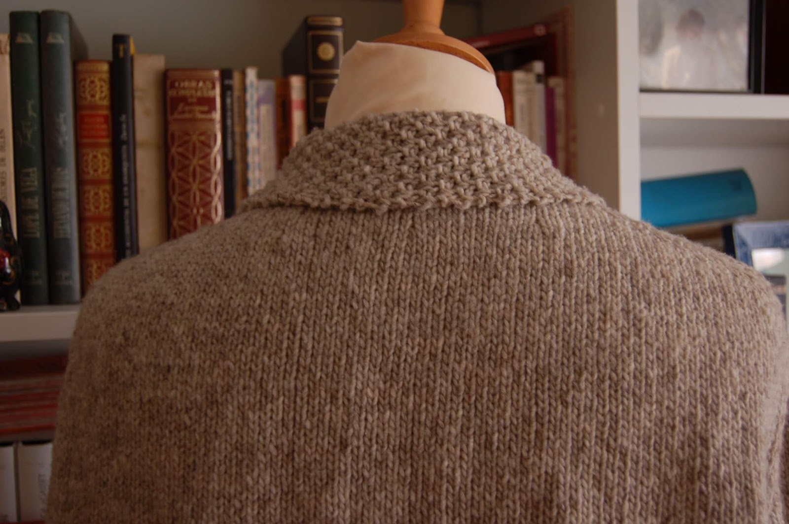 Cambiar a las agujas de 4 mm, tejer 4 vueltas completas del der (ya no hacemos más el calado del panel central), y cerramos todos los puntos del der en la 5º. Repetir el proceso para la otra manga, coser los botones, rematar las hebras que sobran, y listo! Y a celebrar, porque ya tienes tu chaqueta empezada por el cuello, con abertura lateral.