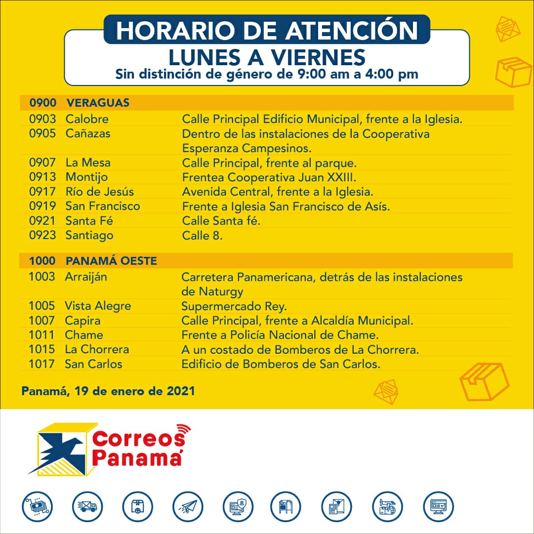 Dirección General de Correos y Telégrafos (Vista Alegre) Provincia. Lunes a Viernes 7:00 am - 6:00 pm, Sábado 7:00 am - 5:00 pm. Institución . Correos y Telégrafos Nacionales de Panamá.