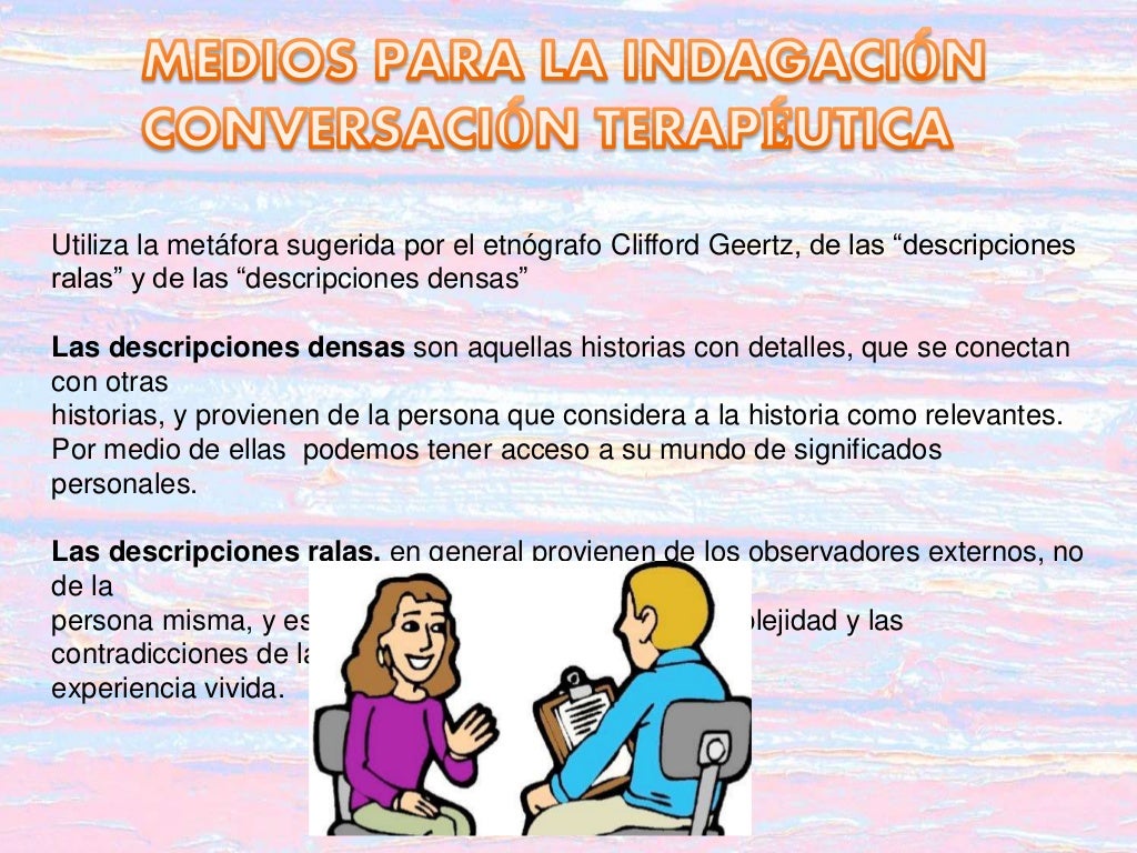 20/11/2023. La terapia narrativa es una modalidad terapéutica innovadora que se fundamenta en la premisa de que nuestras vidas son moldeadas por las historias que nos contamos sobre nosotros mismos y nuestro mundo. Este enfoque, desarrollado en la década de 1980 por terapeutas como Michael White y David Epston, se centra en la reescritura y.
