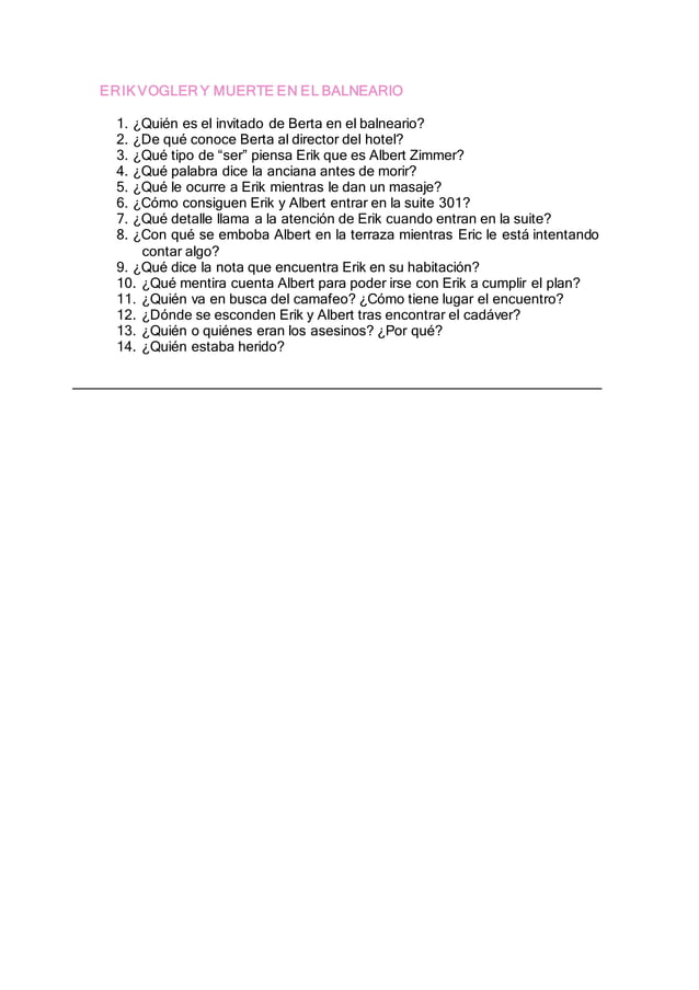 Resumen y sinopsis de Erik Vogler en Muerte en el balneario de Beatriz Osés. Tras los crímenes de Bremen, Erik Vogler necesitaba un descanso. Una cura de reposo, tal y como le aconsejaron los médicos. No en vano, las pesadillas con el "rey blanco" le asediaban casi todas las noches. Por ese motivo, acepta la invitación de su abuela Berta.