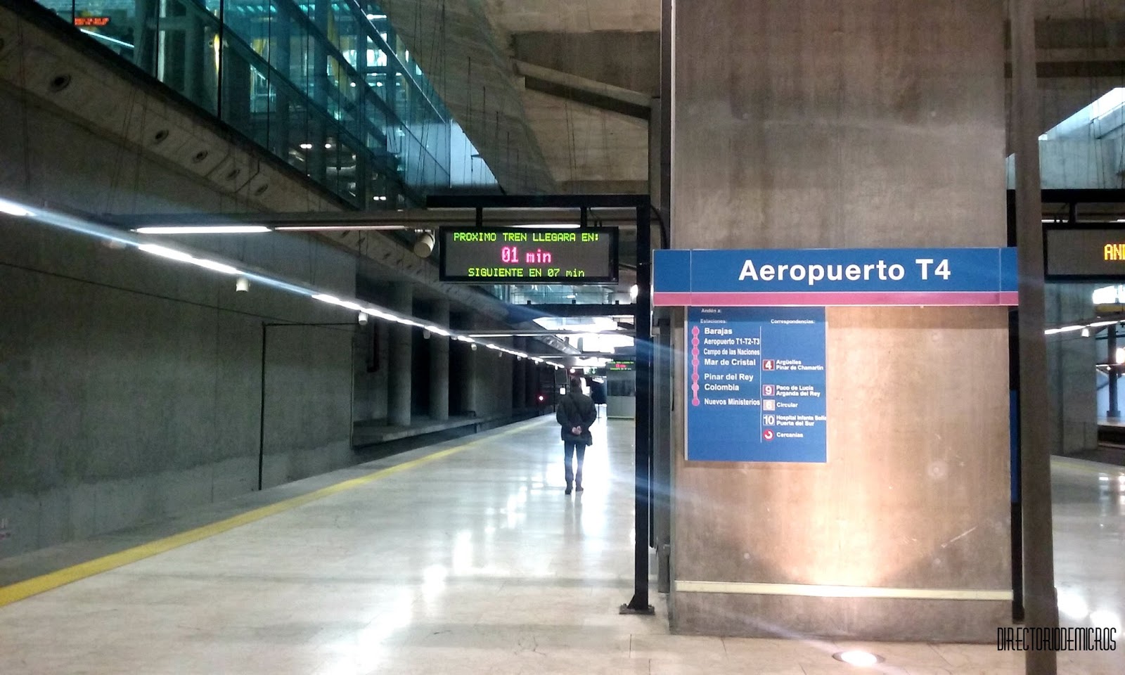 En Metro hasta la T4 ( Terminal 4 ) Desde el 2007 línea 8 de metro lleva a la Terminal T4 (estación Terminal T4). La estación está dos paradas después que la salida de la T1, T2 y T3. Guía de Madrid: Para ir de Madrid al aeropuerto en metro o viceversa tienes que usar la línea 8 del metro de Madrid. El Tiempo medio es de 45 minutos.