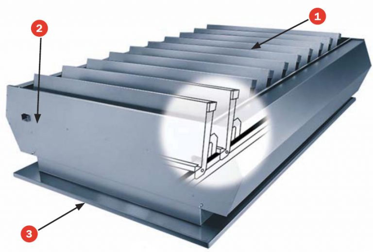 Temperatura del fusible según necesidades: 68ºC, 72ºC std., 93ºC Y 140ºC.. Exutorio rectangular de lamas practicables para la evacuación de humos y gases en caso de incendio, con posibilidad de abertura autónoma con fusible y accionamiento según tipo (Muelle, pistón neumático y cargas CO2, servomotor 24V) a concretar.Posibilidad de.