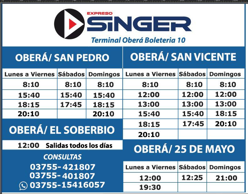 Horarios Expreso Singer Oberá San Pedro San Vicente 25 de Mayo Region Litoral