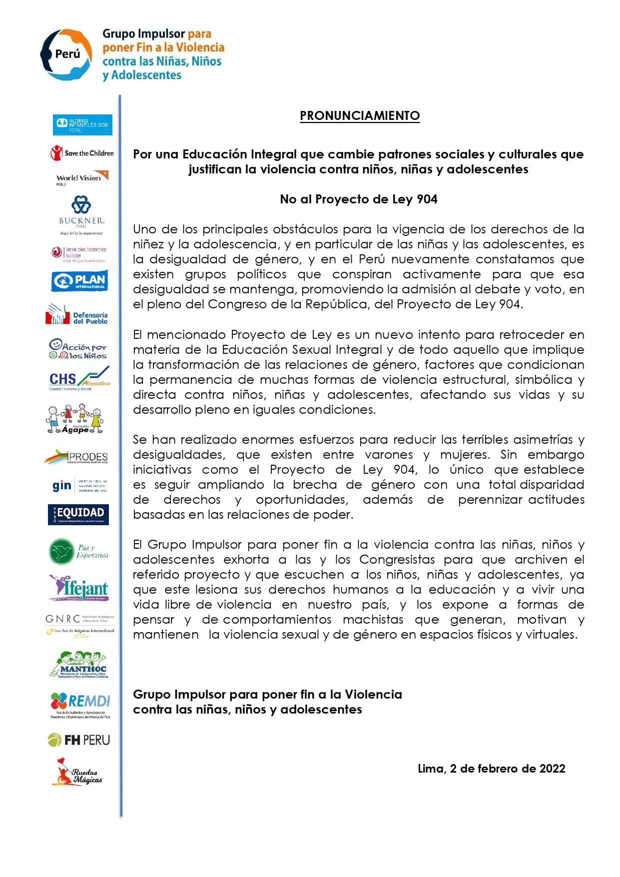 Pronunciamiento No al proyecto de Ley 904 Paz y Esperanza Peru